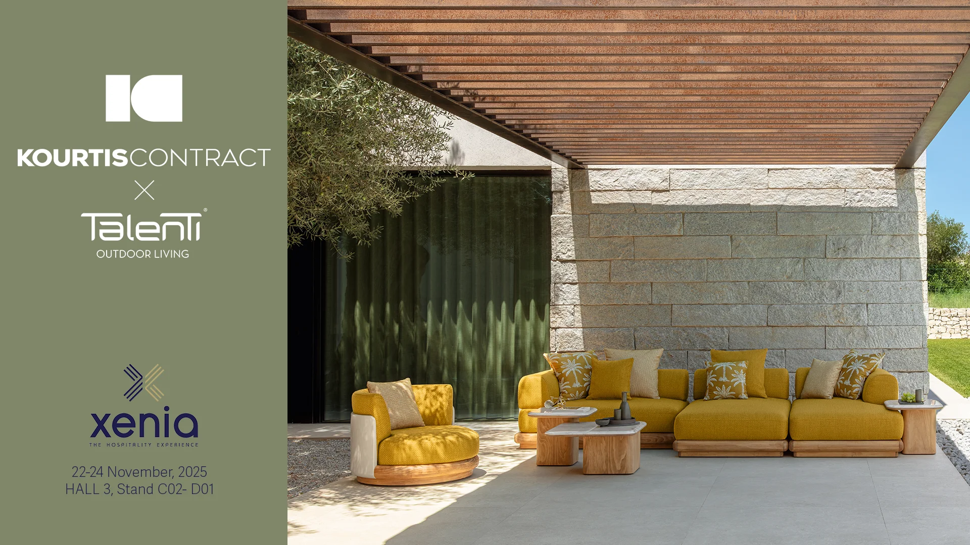 Φέτος, σηματοδοτούμε μια νέα στρατηγική εποχή B2B συνεργασιών με τη σύμπραξη της Kourtis Contract και της Talenti Outdoor Living — ενός διεθνώς αναγνωρισμένου ιταλικού brand που θέτει τα πρότυπα στο outdoor furniture design παγκοσμίως. Η συνεργασία αυτή αποτελεί βασικό πυλώνα της παρουσίας μας στη Xenia 2025 και ενισχύει τη θέση της Kourtis Contract ως κορυφαίου προμηθευτή ολοκληρωμένων λύσεων επαγγελματικής επίπλωσης στον χώρο της φιλοξενίας, με έμφαση στο design, την ποιότητα και την καινοτομία.